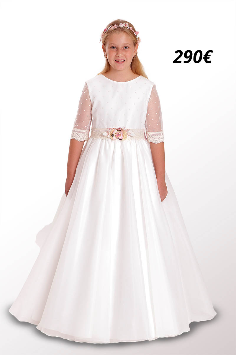 El día dela Primera comunión de la niña debe ser único, especial y recordable, no sólo por los bonitos momentos que vamos a pasar, sino por el vestido que lleve la niña, pues será el punto de atención de cientos de personas y tiene que estar radiante, llamativa y súper guapa. Por ello, ¿qué mejor manera de conseguirlo? que portando con ese garbo que sólo ella tiene, éste vestido de comunión tan elegante y digno para tal evento. No lo dejes mucho más tiempo y cógelo ahora, es tu momento de hacerlo.